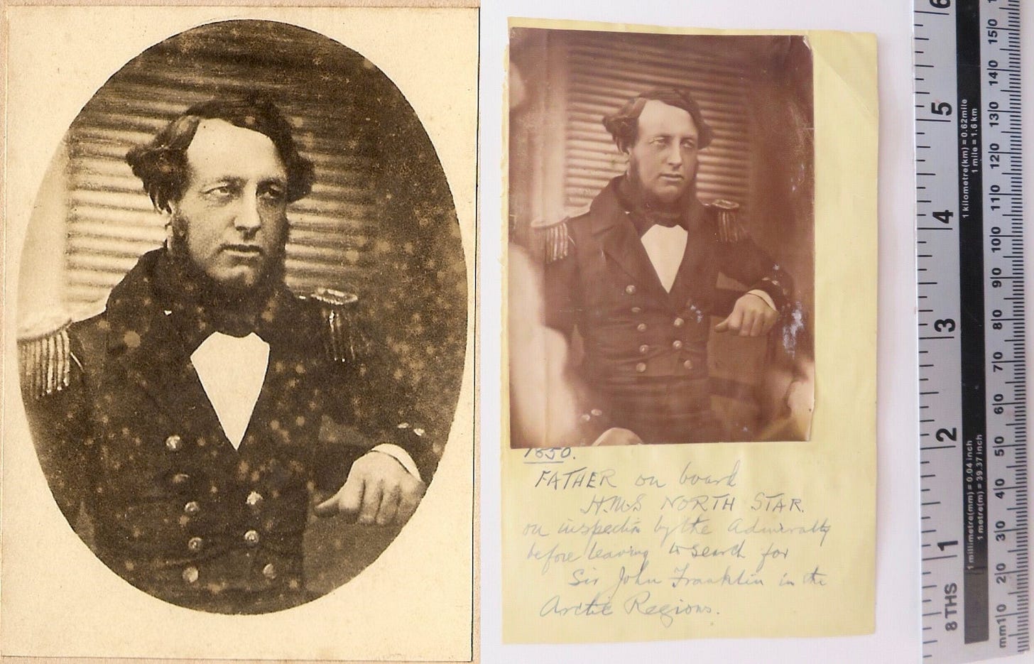 In February of 2023, Jillian Price spotted a portrait photograph at auction on eBay (above, right) of an unidentified Franklin searcher. The caption read: “1850. FATHER on board H.M.S NORTH STAR. on inspection by the Admiralty before leaving in search for Sir John Franklin in the Arctic Regions.” A number of people – I recall Edmund Wuyts and Alison Freebairn – immediately noted the facial resemblance to the Pullen brothers, from their Franklin searcher portraits published in the Illustrated London News during 1852.