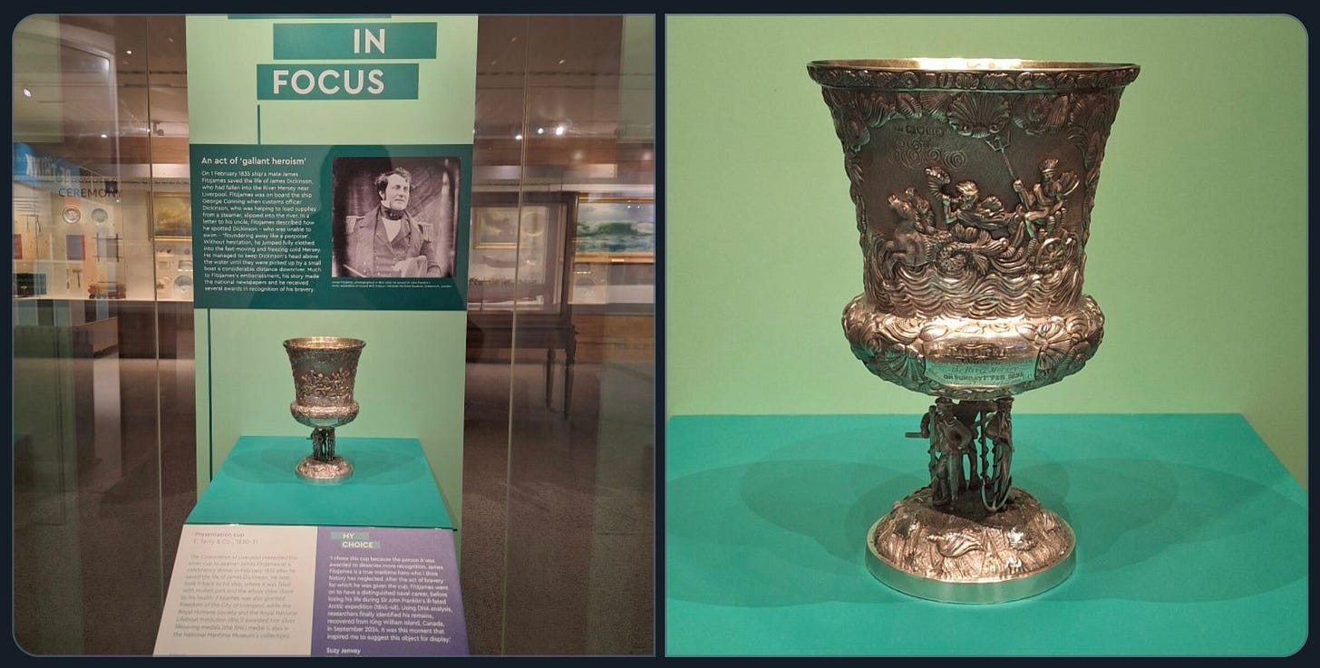 For those intending to visit Greenwich, Fitzjames researcher Fabiënne Tetteroo has spotted that the cup awarded to James Fitzjames for saving a man from drowning in the Mersey is now on display in the museum’s Voyagers gallery (link to Tetteroo’s new photography). Tetteroo’s website publishes Fitzjames’ own account of his action along with other contemporary accounts (link). The Voyagers gallery is on the ground floor near the park entrance, across from the cafe; I’ve added a note about this new display to the Franklin Expedition guide to Greenwich’s Polar Worlds (link).